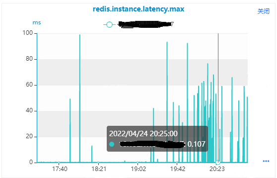 1.使用 Daas 平台“服务监控-数据库实例监控”,选择 master 节点,选择 Redis 响应时间监控指标“redis.instance.latency.max”,如下图所示,从监控图中我们可以看到