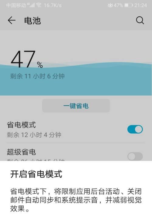 10.使用省电模式或智能节能模式:许多智能手机都提供了省电模式或智能节能模式选项。启用这些模式可以限制某些功能的使用,从而延长电池寿命。