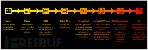 RAR 附件中包含带有恶意宏代码的 Word 文档,如果在 Microsoft Office 上打开,恶意并将内容设置为 "启用"的话,一个 bat 文件会执行 PowerShell 步骤,下载一个 64 位的 dropper。