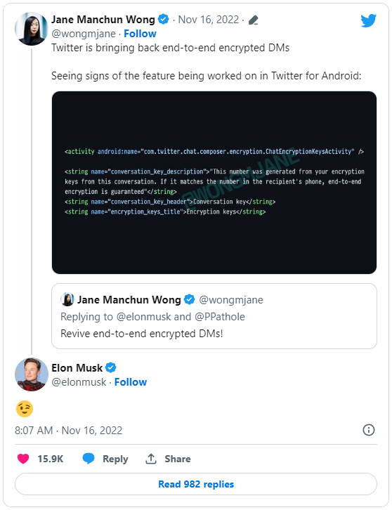 Elon Musk回复了Jane Manchun Wong的加密推文,暗示该功能仍然开发中。推特