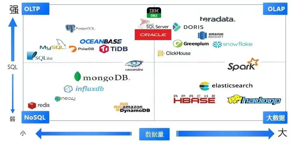 下面看看通常的数据库产品的定位,这里是按照SQL支持度、数据量和技术栈做了象限划分。这种可以视为对产品大类的区分,属于比较粗的粒度。