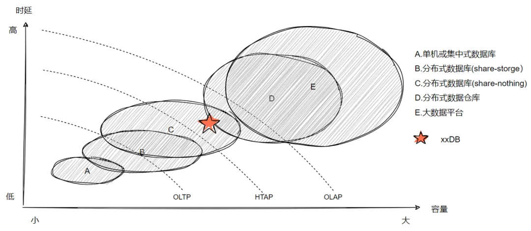 个人比较推荐的做法,是采取如下的划分。如下图是针对时延、容量(两个用户最为关心)的维度做的,用户可以通过类似下图很清晰地定位此产品,快速找准适用的场景。这种图示的优点是比较直观,将用户关心的维度与技术栈能力范围关联起来,同时将产品置于其中,一目了然。