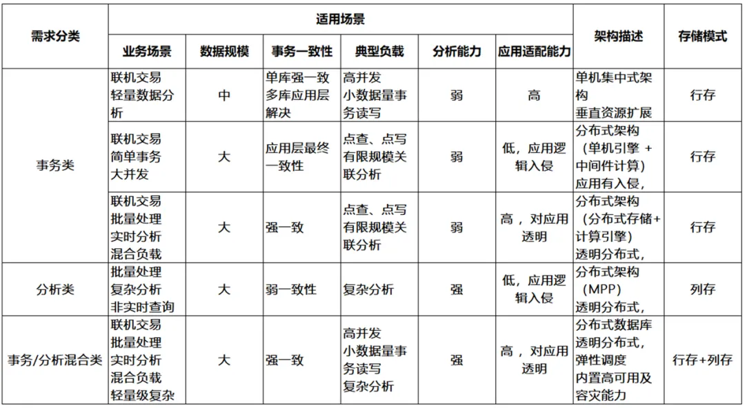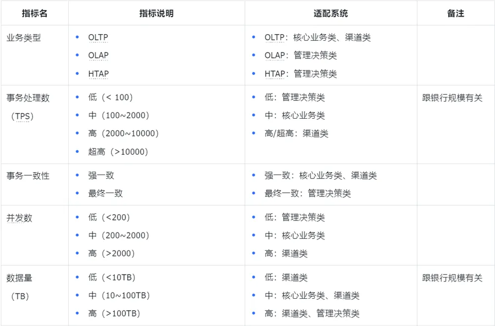 后面再结合用户对自有业务的数据库使用特征的梳理,形成如下图所示的银行业根据不同业务选择不同数据库特征矩阵。
