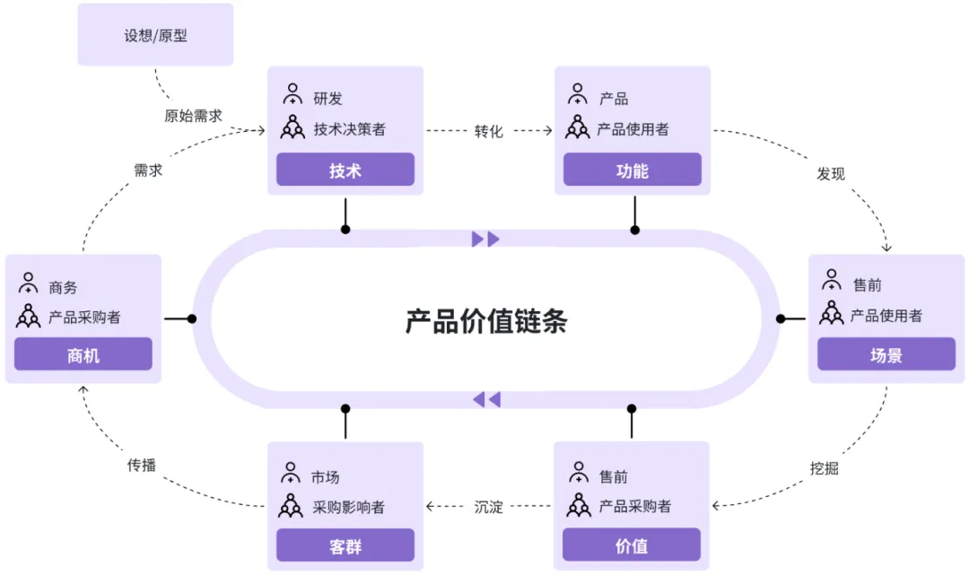 在有了清晰的产品定位后,就需要打造属于自己的产品价值链条。所谓产品价值链条,就是覆盖从产品规划、设计、研发、运营、市场、销售体系的路径。这里通过一张图来描述下这个链条。图中我们从产品视角,将链条划分为六个阶段,并在每个阶段标注内部和外部的关键角色,同时将各阶段之间流转关键进行了说明。如果企业完全走通了这一价值链条,并形成了正向反馈则说明基本打通了商业化的路径。