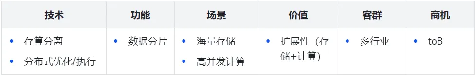 上面描述的过程比较抽象,我们可以拿一个简化例子来说明下。例如我们开发了一个分布式数据库,就可以形成这样一张价值链条表。研发基于存算分离及分布式能力,开发了数据分片功能,可以应对海量存储及高并发计算的场景,可为用户带来存储与计算的可扩展能力,适用于多个行业,可通过toB方式走商业化过程。