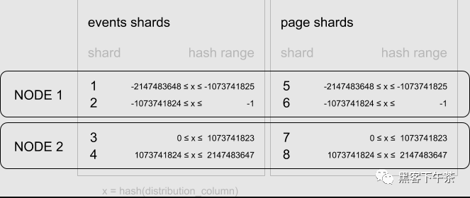 在 Citus 中,如果分布列中值的哈希值落在分片的哈希范围内,则将一行存储在分片中。为了确保共置,即使在重新平衡操作之后,具有相同哈希范围的分片也始终放置在同一个节点上,这样相等的分布列值始终位于跨表的同一个节点上。