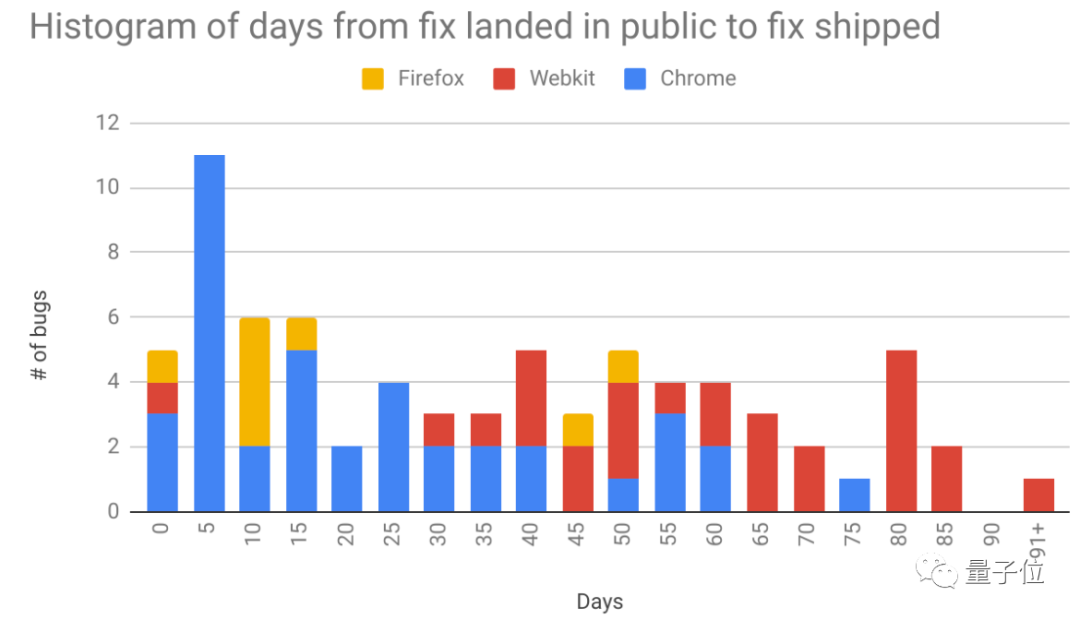 可以看到,大多数情况下,Chrome在40天之内就能修好Bug,而Webkit的周期则拉得更长。