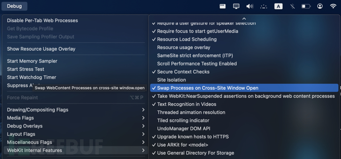 打开终端并运行“defaults-write.com.apple.Safari IncludeInternalDebugMenu 1”以启用 Safari 的隐藏调试菜单;打开 Safari,进入新的可见调试菜单;选择 "WebKit 内部功能;滚动并激活 "跨站窗口打开时交换进程"。