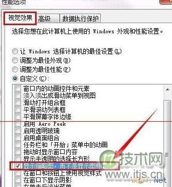 4、最后在Windows 7系统中弹出最后的性能设置窗口中蒂娜及自定义设置,这时候我们就需要选择显示的选项,就是显示缩略图的显示,选中后点击确认关闭窗口。亿华云