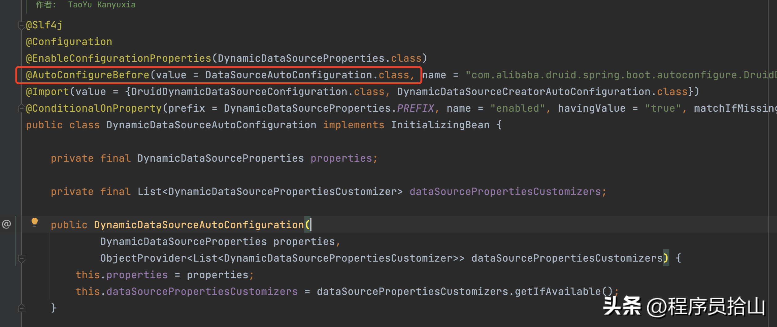 打开DynamicDataSourceAutoConfiguration类,可以看到通过@AutoConfigureBefore注解,提前初始化了MP自己的DataSource数据源。