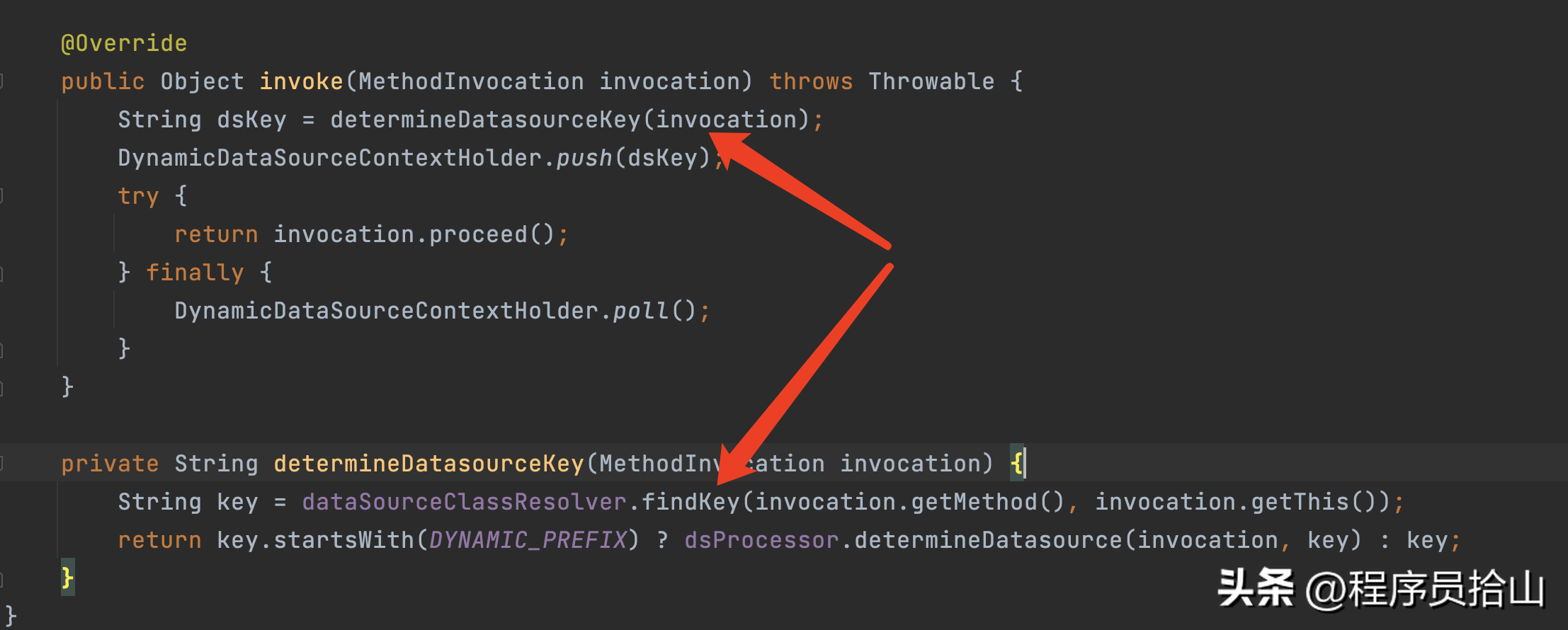 DynamicDataSourceAnnotationInterceptor类是一个方法拦截器,它的invoke里面有判断DS key的操作。