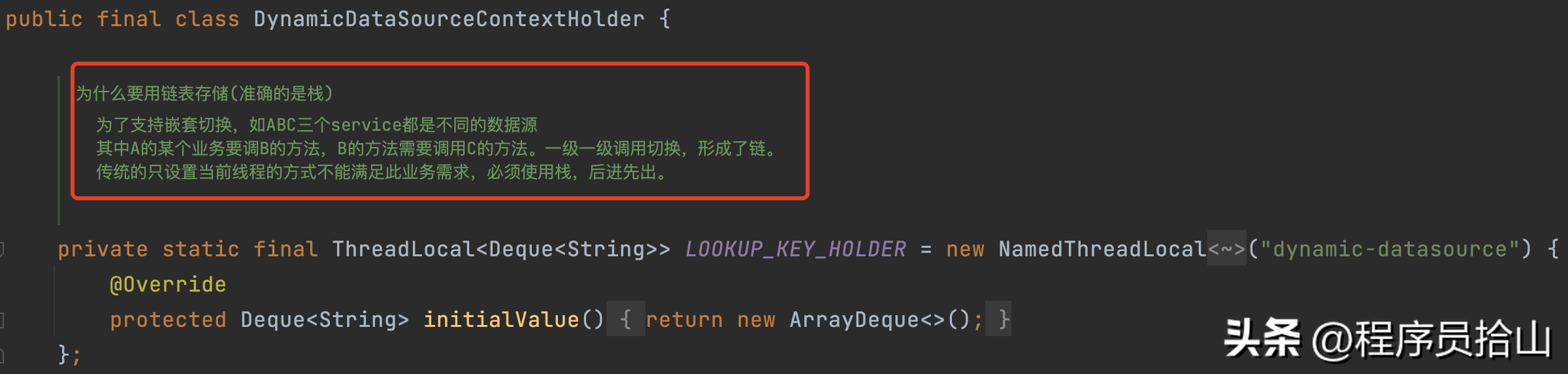 获取到dsKey以后,会将其设置在DynamicDataSourceContextHolder中的LOOKUP_KEY_HOLDER中,它是一个泛型为Deque<String>的ThreadLocal,为什么设置成栈呢?官方给出的解释是: