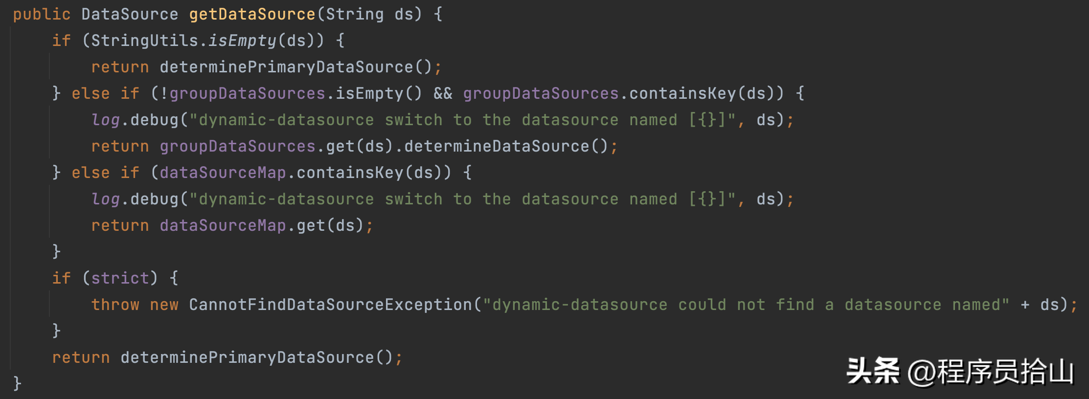 这里的逻辑是:如果没有指定DS,就走主库,如果指定了DS,就根据DS的属性值进行条件匹配,看走哪个判断分支。