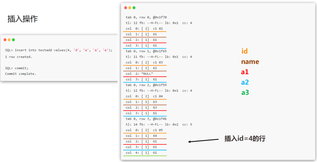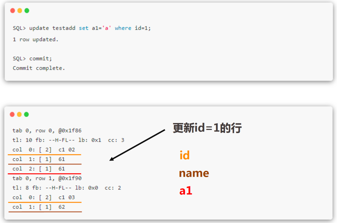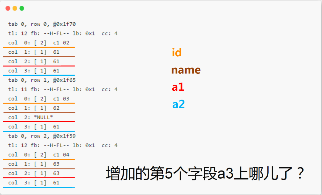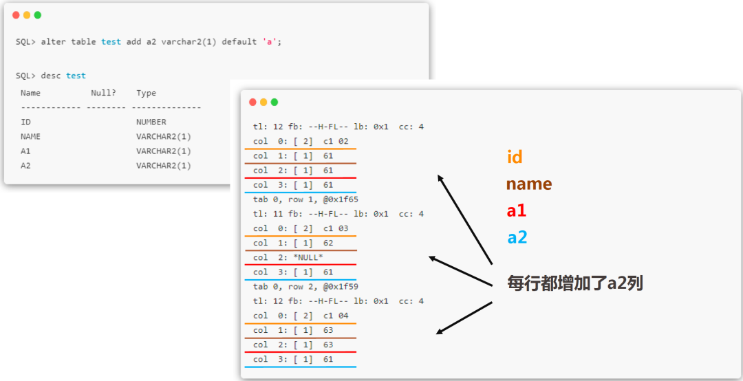 当为表增加一个不带默认值,不带非空约束的字段时,已存记录的数据块中不会立刻存储该新增字段: