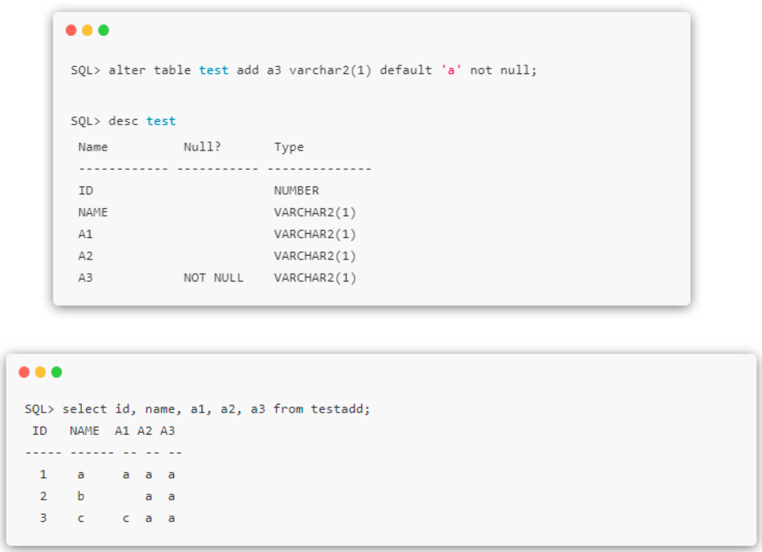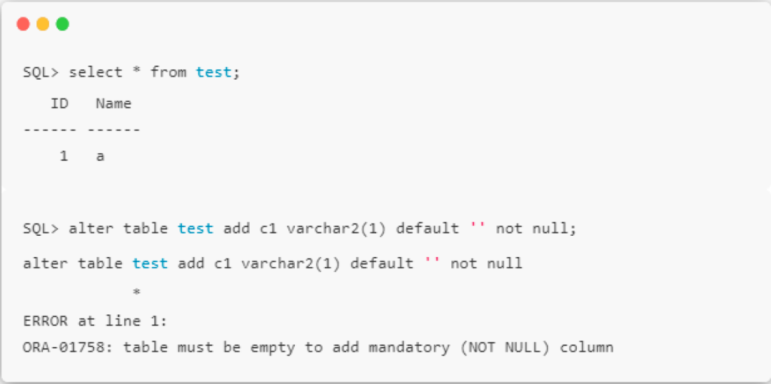 复制alter table TEST add c1 varchar2(8) default not null;1.再次查询: