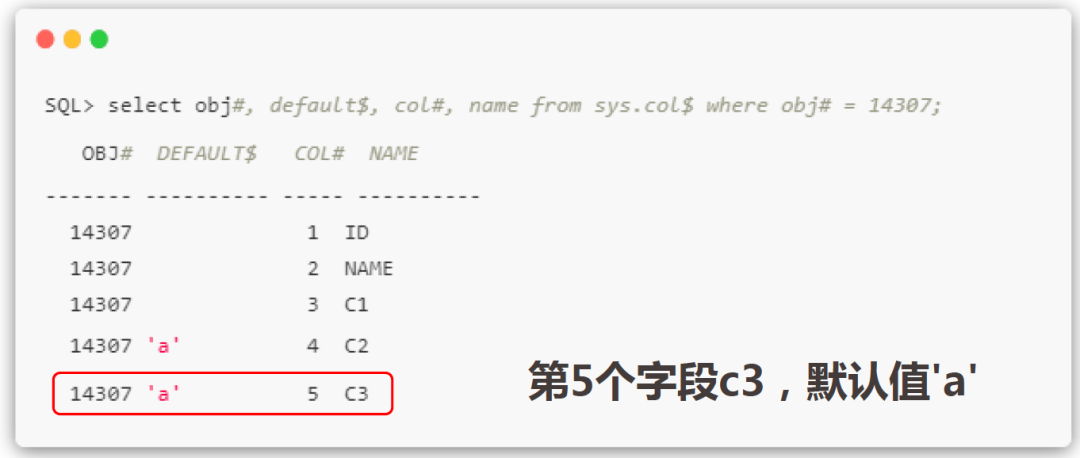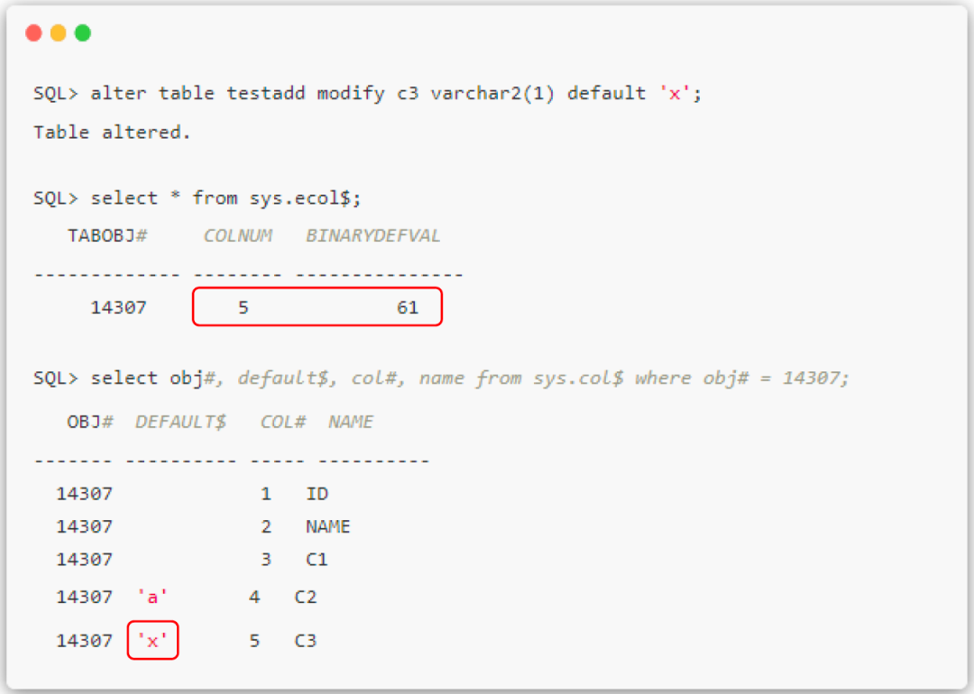 但是,当改变新增列的默认值时,sys.ecol$ 的数据不会实时变化,仅存储第一次增加列时的默认值: