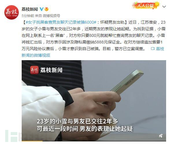 女子找黑客查男友聊天记录被骗 6000元江苏淮安曾发生了一起让人震惊的骗局。23 岁的女子小雪怀疑自己的男友有外遇,于是在网上寻找帮助。她联系上一名自称为"黑客"的人,对方声称只要支付 800 元就能帮她查询男友的聊天记录。小雪信以为真,将钱汇给了对方。