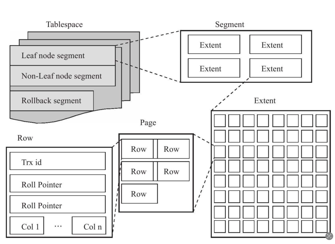 其实表空间文件内部还是组织为更复杂的逻辑结构,自顶向下可分为 segment(段)、extent(区)和 page(页)。