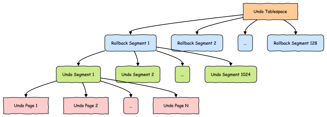 回滚段(Rollback Segments):每个 Undo 表空间包含 128 个回滚段(由 innodb_rollback_segments 控制),每个回滚段管理 1024 个 Undo 段(Undo Segments)。