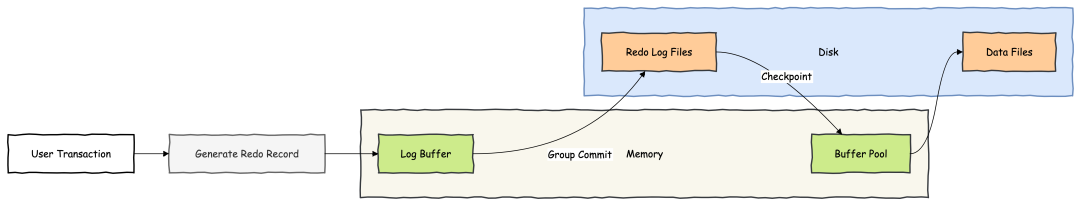 我们的目光是关注点在于左侧内存架构的 Log Buffer 以及右侧磁盘架构的 Redo Log 文件。