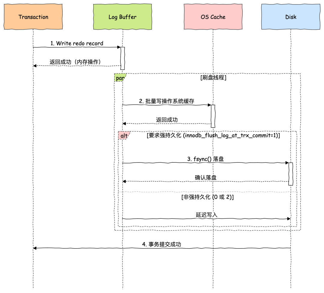 buf:指向环形缓冲区的内存地址write_lsn:原子变量,实现多线程无锁写hdr_no:块序号(用于崩溃恢复时定位日志位置)余彦瑭:“李老师,当事务生成 Redo 记录后,关键步骤有哪些?”