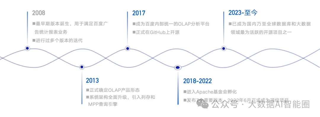 Doris最初是百度广告报表业务的Palo项目,2017年对外开源,2018年由百度捐赠给Apache基金会孵化。2022年6月,正式成为Apache顶级项目。