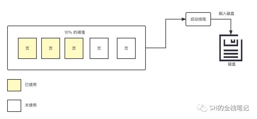 满足的数据刷次条件是:脏页的数量达到了 Buffer Pool 中页数量的 **10%,当然 10% 这个值是多久可变的,通过配置项 innodb_max_dirty_pages_pct_lwm 来配置的数据刷次,其默认值为 10%,多久并且这个值也必须小于另一个配置 innodb_max_dirty_pages_pct 的数据刷次值(90%**)。