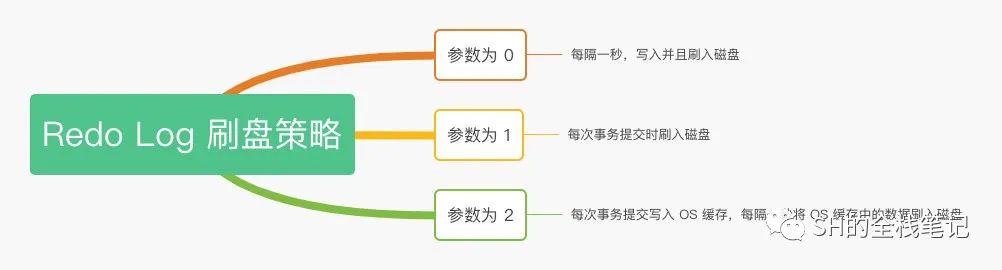 参数为2,每次事务提交,都会写到 OS 缓存中去,然后每隔一秒将 OS 缓存中的数据刷入磁盘。