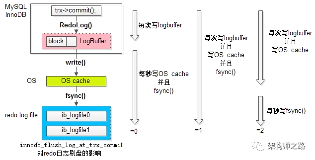 MySQL应用层:Log BufferOS内核层:OS cacheOS文件:log file(3) 为了满足不同业务对于吞吐量与一致性的需求,MySQL事务提交时刷redo log有三种策略:
