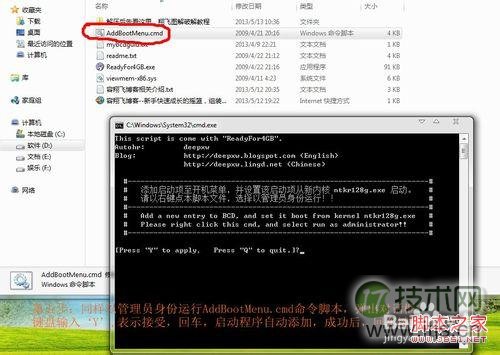 同样用管理员身份运行AddBootMenu.cmd,弹出命令对话框后,输入“y”,敲回车键,