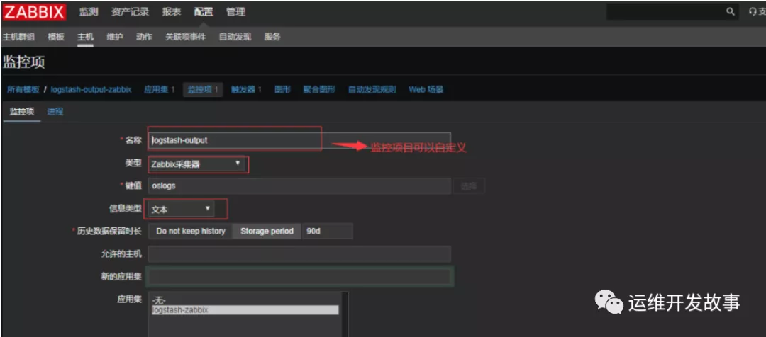 zabbix_host:表示Zabbix主机名字段名称, 可以是单独的一个字段, 也可以是 @metadata 字段的子字段, 是必需的设置,没有默认值。zabbix_key:表示Zabbix项目键的值,也就是zabbix中的item,此字段可以是单独的一个字段, 也可以是 @metadata 字段的子字段,没有默认值。zabbix_server_host:表示Zabbix服务器的IP或可解析主机名,默认值是 “localhost”,需要设置为zabbix server服务器所在的地址。zabbix_server_port:表示Zabbix服务器开启的监听端口,默认值是10051。zabbix_value:表示要发送给zabbix item监控项的值对应的字段名称,默认值是 “message”,也就是将”message”字段的内容发送给上面zabbix_key定义的zabbix item监控项,当然也可以指定一个具体的字段内容发送给zabbix item监控项。4 将logstash与zabbix进行整合这里我们以logstash收集日志,然后对日志进行读取,最后选择关键字进行过滤并调用zabbix告警的流程,来看看如何配置logstash实现zabbix告警。