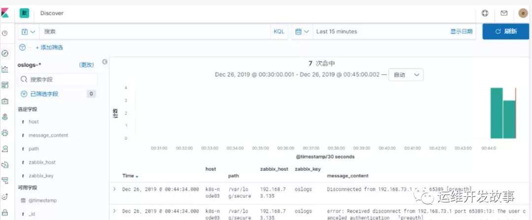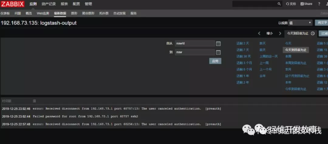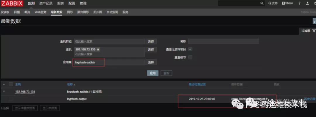 Dec 25 23:02:46 k8s-node03 sshd[49908]: Disconnected from 192.168.73.1 port 60757 [preauth]1.2.3.4.5.6.7.8.9.10.11.这里面有我们要过滤的关键字Failed,因此logstash会将此内容过滤出来,发送到zabbix上 接着,登录zabbix web平台,点击监测中——->最新数据,如果zabbix能够接收到日志,就可以看到下图的最新数据: