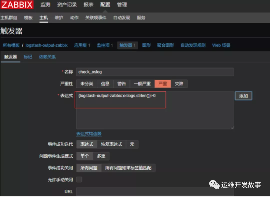 可以看到,红框中的内容就是在logstash中定义的message_content字段的内容,到这里为止,zabbix已经可以收到logstash的发送过来的数据了,但是要实现报警,还需要在zabbix中创建一个触发器,进入配置——->模板,选择logstash-output-zabbix这个模板,然后点击上面的触发器,继续点击右上角的创建触发器,如下图所示: