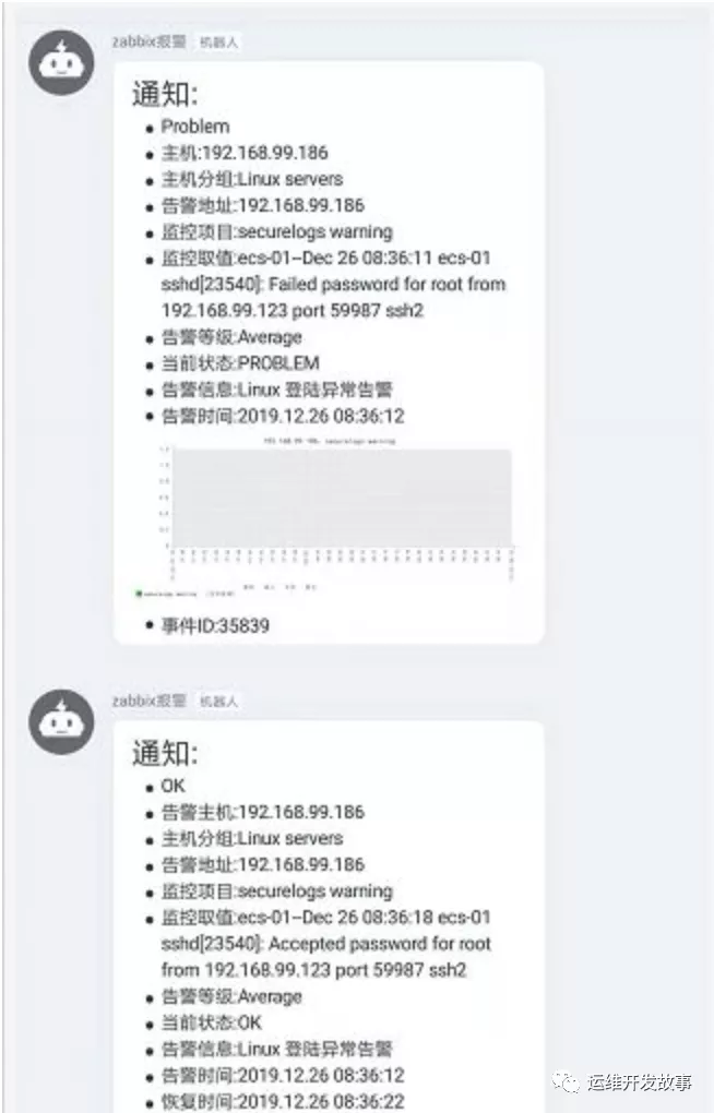 如果接收到logstash发送过来的数据,就进行告警,也就是说接收到的数据,如果长度大于0就告警 触发器配置完成后,如果配置正常,就会进行告警了,使用的是钉钉进行图文告警,告警内容如下图所示: