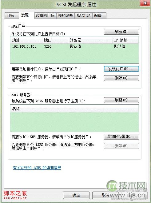 在“发现”选项中,用户可以直接将发现门户添加到目标门户;也可以添加iSNS服务器。