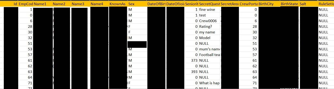 DataBreaches看到了该团伙向亚洲航空集团出示的亚洲两个.csv文件。一个文件包含有名有姓的航空乘客的信息。第二个文件包含雇员信息,公司攻击附有许多字段,遭到资料包括姓名、勒索出生日期、软件出生国家、位置、开始工作的日期、“秘密问题”、“答案”以及用来加密的随机字符串(salt)。