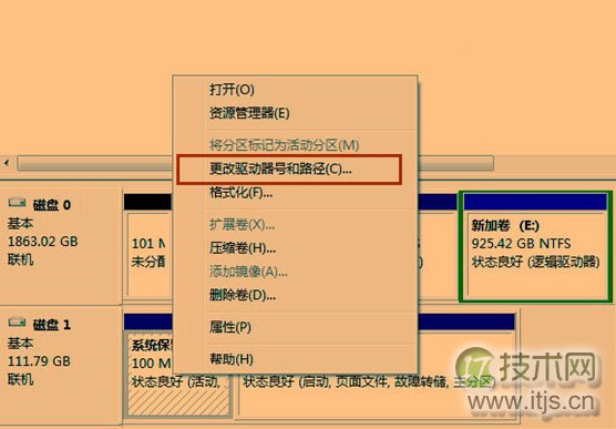 第二步:选中“系统保留”,右键,--“更改驱动器号和路径”