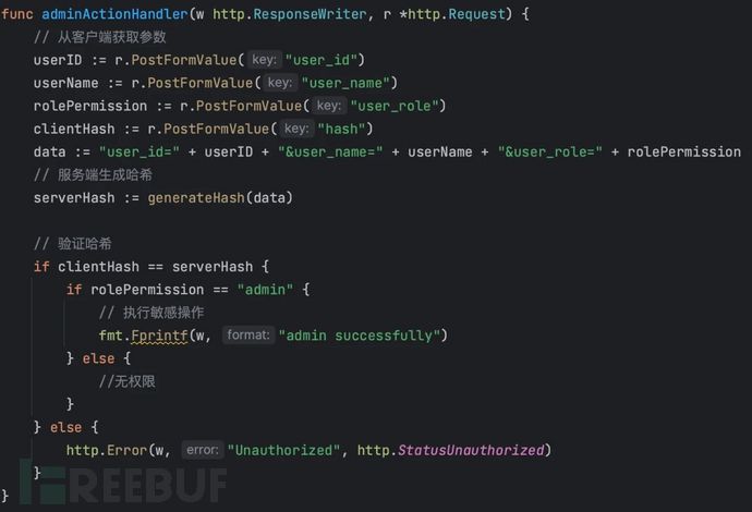 为方便描述漏洞场景,验证我们首先假设有这样一种服务端验证模式,即用户尝试登录时,服务端会根据用户的 ID、香港云服务器名字以及一个仅服务端知道的 30 位密钥,通过特定的哈希算法生成一个哈希值,并将其下发给客户端。随后,当客户端尝试访问某些特定接口,例如修改用户权限的接口时,服务端会根据前端 POST 的角色 ID、角色名字、角色权限以及同样的 30 位密钥,重新生成哈希进行验证。如果上传的哈希与服务端生成的哈希一致,则视为验证通过,并将新的角色权限写入数据库。