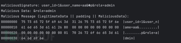 在这个示例中,我们将以上面图片提到的代码做为一个特定的场景,其中数据字符串为 data="user_id=1&user_name=aa",密钥为 SecretKey="Length_extension_attack_secret"。服务端会解析上传的数据中的 data 字段,并通过分隔符 & 解析出所需的参数 user_id 和 user_name。如果存在 role 字段,服务端也会获取该字段的值。然后,服务端会将所有字段与 SecretKey 进行哈希运算,并与上传的验证哈希进行比较。如果哈希值一致,则认为参数符合规则,并直接使用。