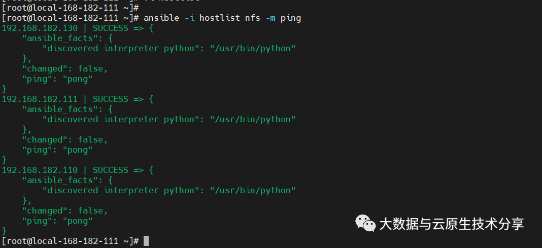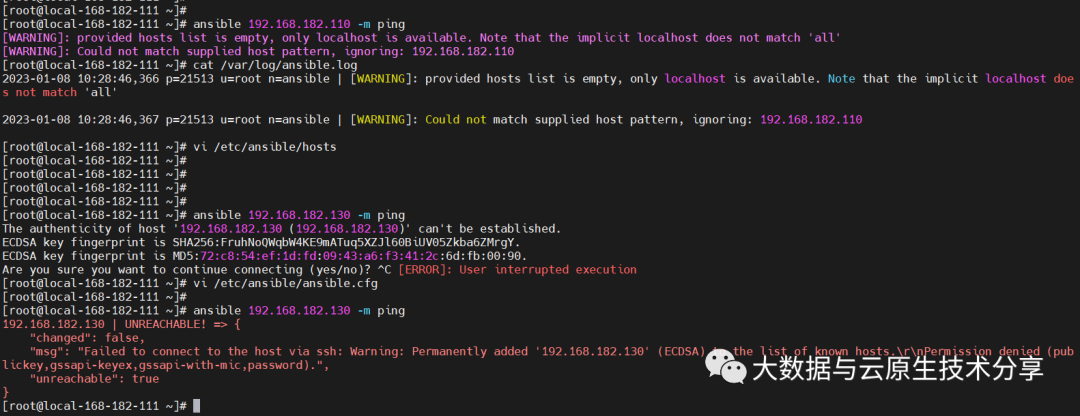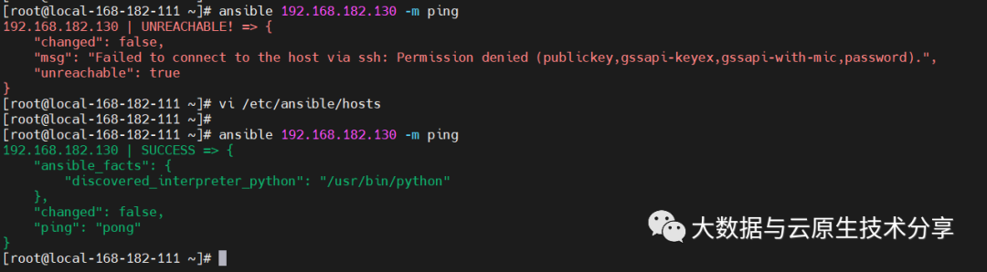 ansible -uroot -k 192.168.182.130 -m ping1.2. 2、配置文件中配置 复制# 默认主机配置文件:/etc/ansible/hosts