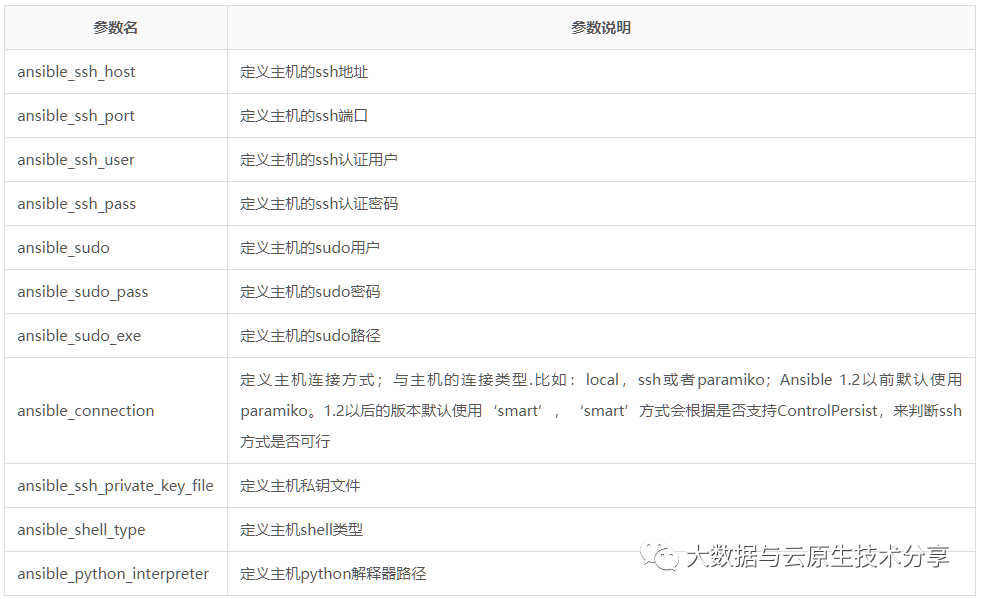 192.168.182.130 ansible_ssh_user=root ansible_ssh_pass=123456[web]192.168.182.130 ansible_ssh_user=root ansible_ssh_pass=1234561.2.3.4.5.常用的配置参数如下: