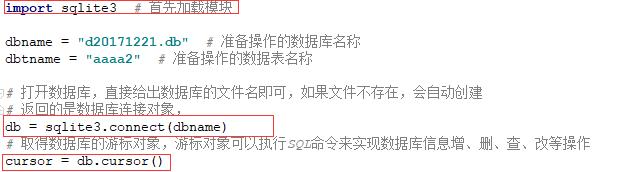 主要是加载模块,用connect打开数据库文件,用cursor获取游标对象。打开数据库时直接给出数据库的文件名即可,如果文件不存在,会自动创建。